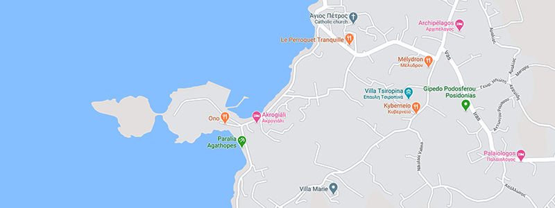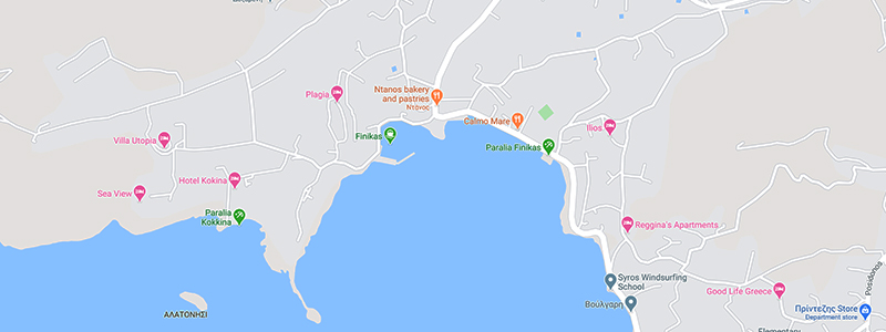 Agathopes beach is one of the most popular beaches of Syros. Guests can swim in the clear blue waters and enjoy a coffee or meal in the cafeterias and taverns along the beach. Just 1 km from the beache of Foinikas, Agathopes constitute a point of reference for travelers during the summer. The small path leading from the beach into the sea as well as the Stroggylo islet, the Schoinonisi and the impressive lighthouse in Cape Viglostasi add some extra charm to the already breathtaking scenery.